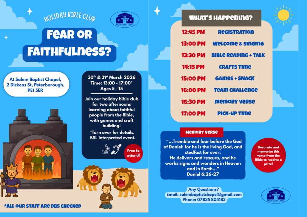 There shall be a holiday Bible Club on Monday the 30th & Tuesday the 31st of March 2026 to which children and young people aged 5 to 15 years old are invited. Please see the flyer below.
